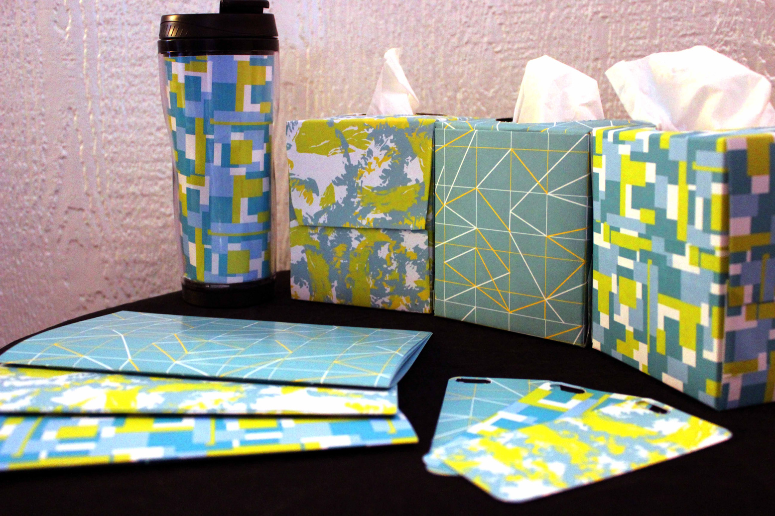 These products were created from digital pattern designs. The abstract designs were styled to have the same color-story yet distinguished pattern variations.