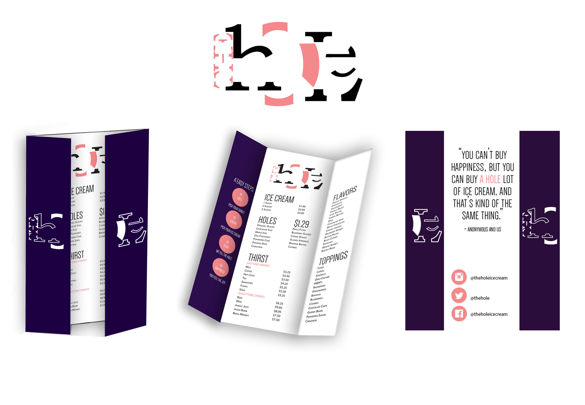 Custom Logo and *mock menu design for an ice cream sandwich cafe. The logo challenge was to remove as much of the alphabet lettering without loosing readability. The concept for the cafe’s aesthetic is for customers to feel like they have just entered a secret cozy cave; to convey that vibe the menu is split down the middle to replicate entering The Hole and uncovering delicious secrets.
