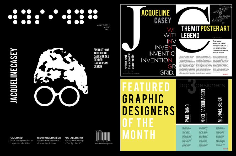 The objective was to create a *mock magazine (5-page) layout that gave tribute to a renown Graphic Designer. The logo for the magazine title WYSIWYG (which stands for “What You See, Is What You Get") was curated using braille letters to symbolicalize that what you 'get' out of what you 'see' is not only about what is seen, but also about what is felt. The magazine features Graphic Designer Jacqueline Casey; adopting her style of solid black backgrounds, abstract figures in white, large rotating lettering, and word puzzles.